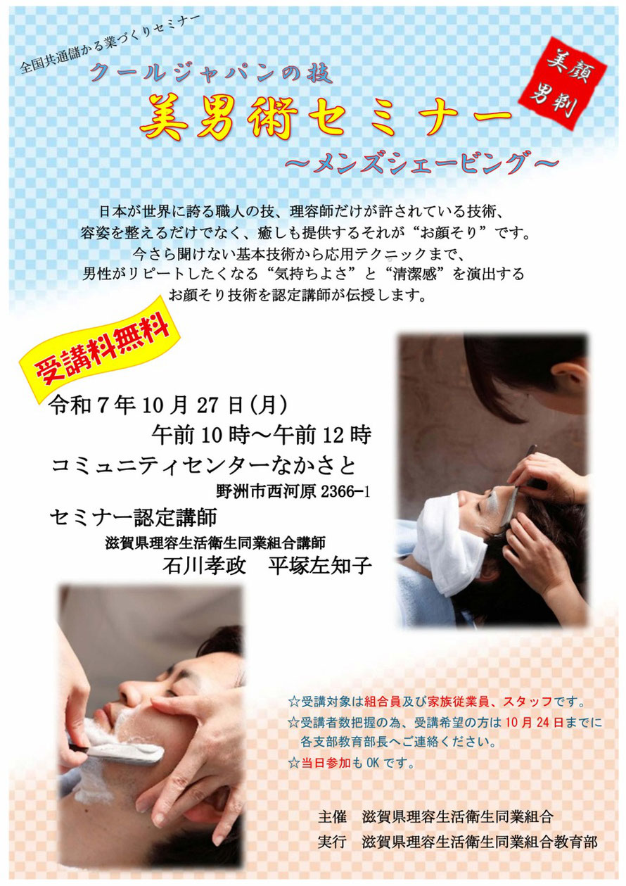お知らせ · 2025/08/25 クールジャパンの技 美男術セミナー ~メンズシェービング~ 開催のお知らせ 全理連が主導する令和7年度 儲かる業づくり事業として、標記セミナーを開催いたします。奮ってご参加ください。 クールジャパンの技 美男術セミナー ~メンズシェービング~ 開催案内.pdf PDFファイル 417.9 KB ダウンロード tagPlaceholderカテゴリ: