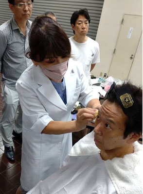 『クールジャパン技・美女男術セミナー』近畿地区協議会講師認定講習会では、「後方0度から…」というような理容学校で学んだシェービングの工程を見直す事で、ワンランク上の上質なシェービングを、そしてファンデーション等を使用した男性のメイク技法を学びました。