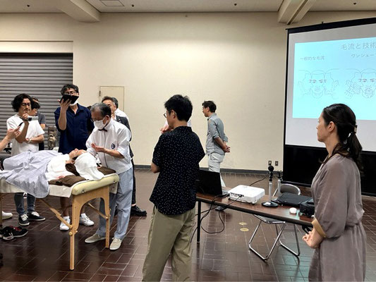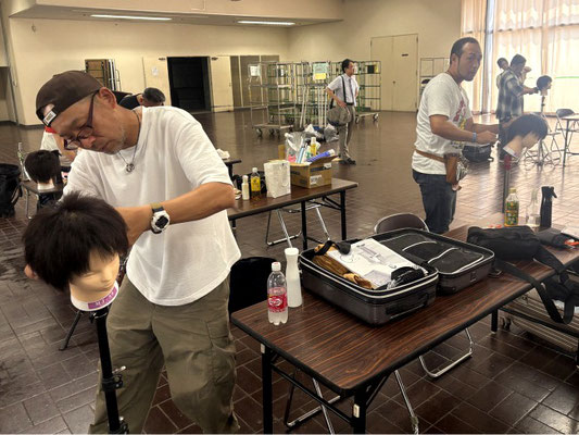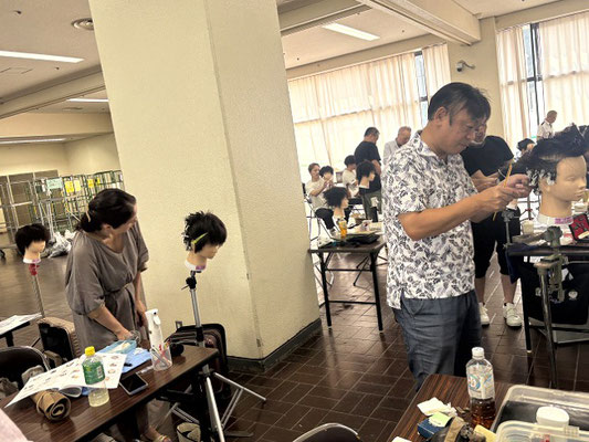 滋賀県理容組合講師会からは7名の講師が受講し、セイムレイヤーのようなカットと流行りのフェザーパーマ風の柔らかいピンパーマを学びました。